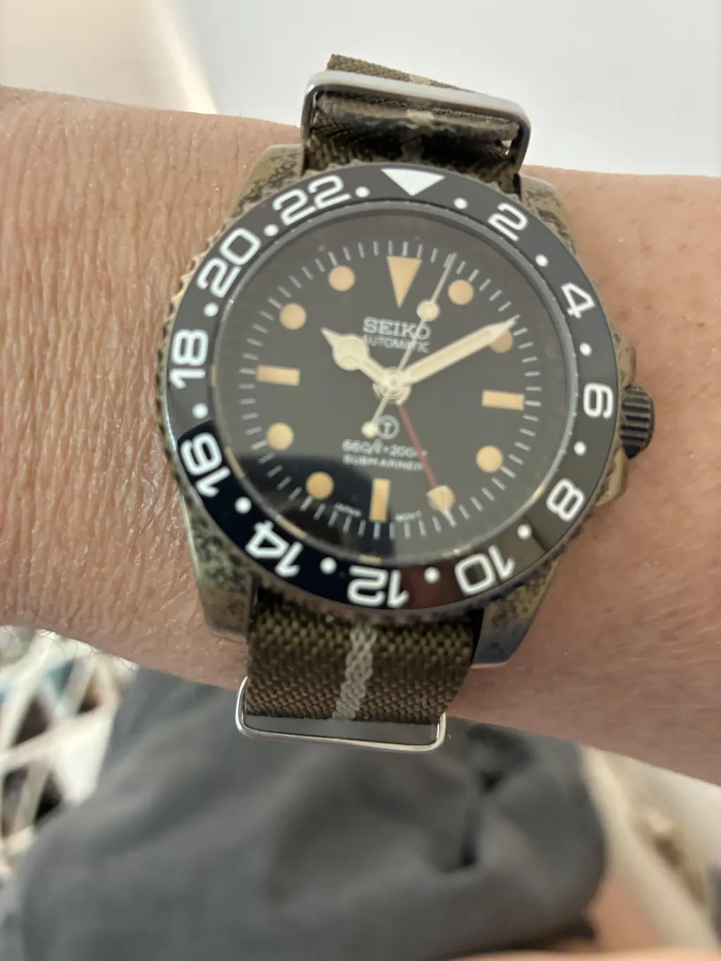 Anonymous The rotating bezel is not the same as the ones shown. It has a larger numeric font. In fact you show two types, the submariner type and the GMT type. I received the second type with large font. I am pleased with the watch generally and the packaging provided (plastic box and small screwdrivers). Please make your advertisement clearer to gain an extra star.